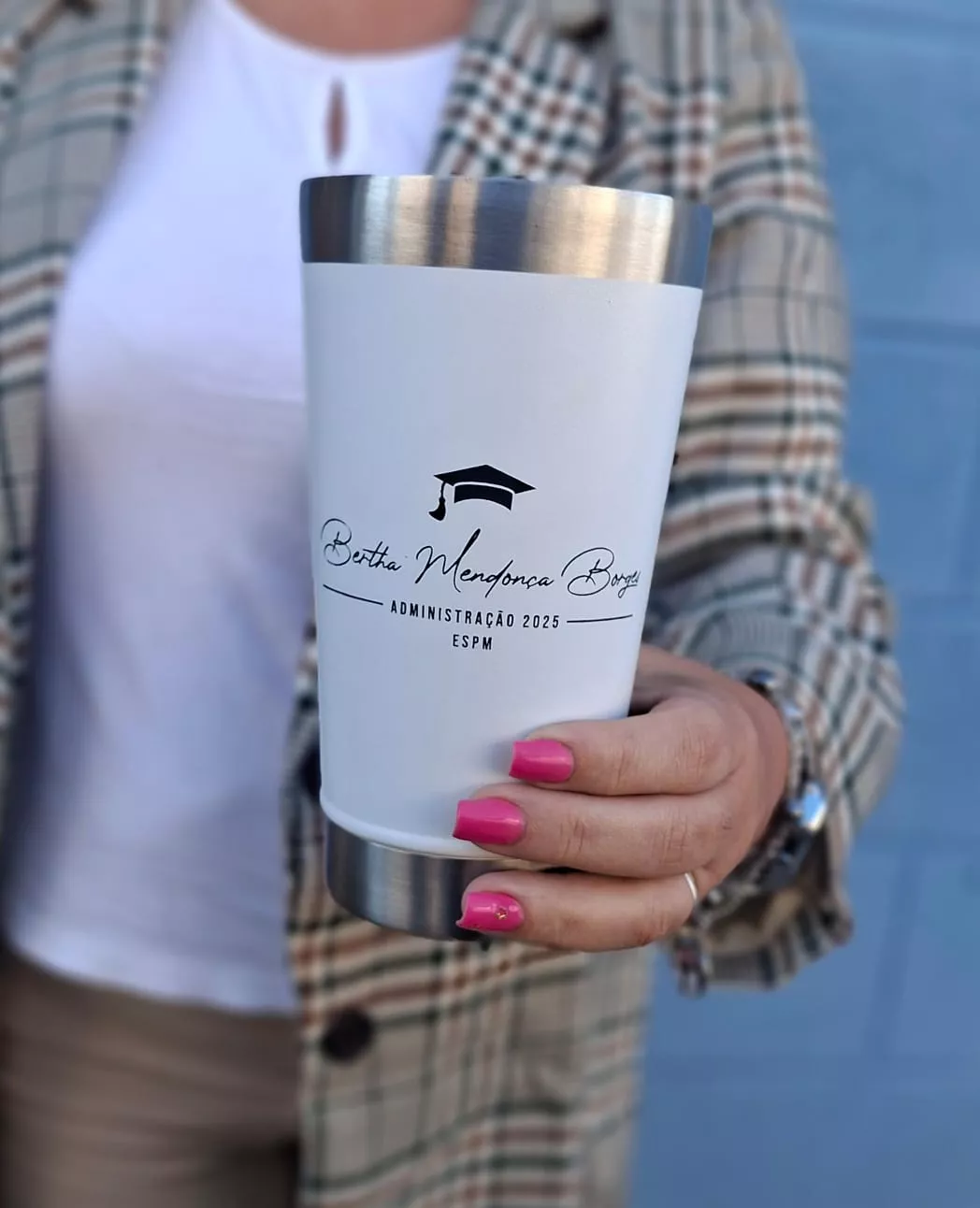 Quando o objetivo é unir utilidade diária com visibilidade de marca, o Copo Térmico personalizado da DNA Copos entrega. Com capacidade entre ~400 ml e 500 ml, ele mantém a temperatura da bebida, incentiva o uso constante — o que significa que sua marca está presente na rotina do cliente ou colaborador. Ideal para ações corporativas, academias, incentivos internos ou presentes de alto nível.